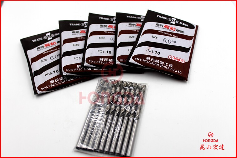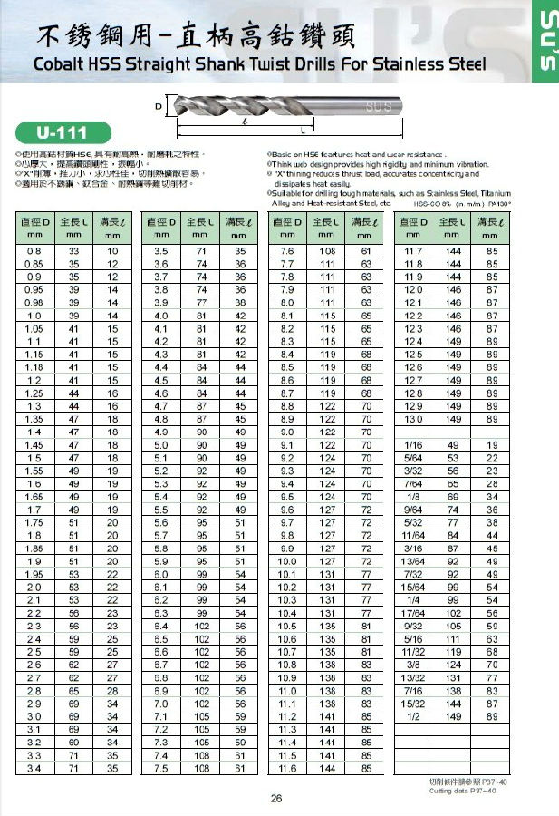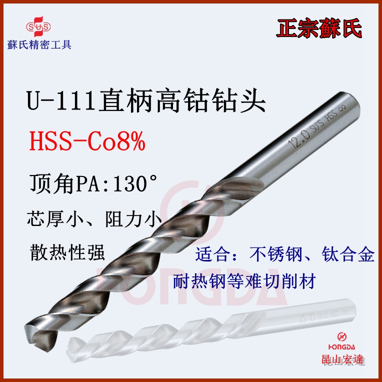 苏氏SUS高钴钻使用高钴材质HSE,具有耐高热,耐磨耗之特性.心厚大,提高钻头刚性,振幅小.“X”削薄,推力小,求心性佳,切削热扩散容易。加工硬度30°--40°,顶角130°,螺旋角38°,材质HSS+8%CO,自身硬度62°-68°M42。
