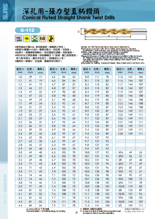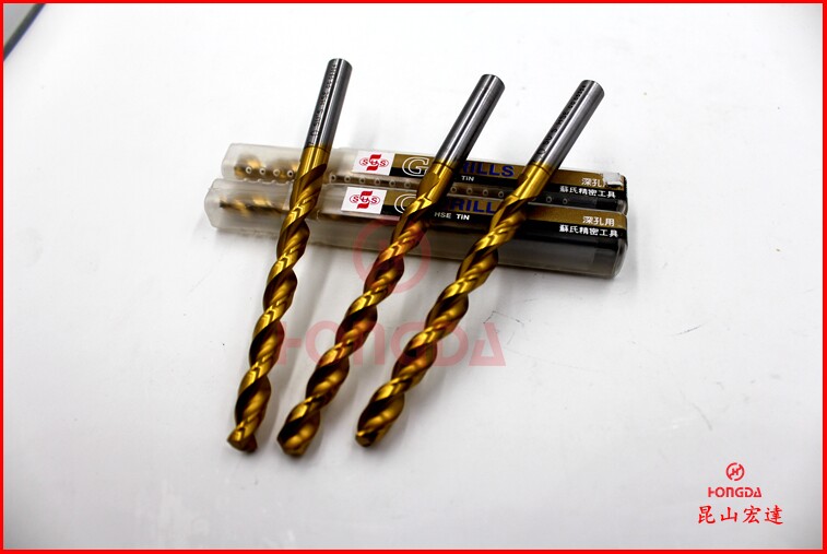 苏氏SUS深孔钻使用高钴材质HSE,具有耐高热,耐磨耗之特性.顶角130°,螺旋角38°,材质HSE+TIN膜层HV2000摩擦系数小,抗粘著,切削佳。